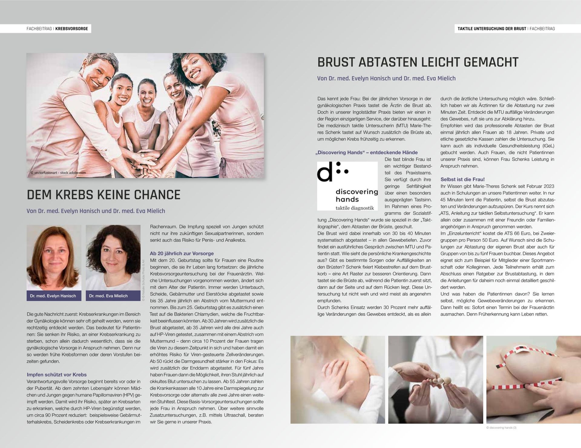 Seit Februar 2023 bieten wir zudem eine Anleitung zur taktilen Selbstuntersuchung der Brust an (ATS) an. Frau Schenk ist fast blind und hat daher einen ausgeprägten Tastsinn, den sie intensiv geschult hat.
