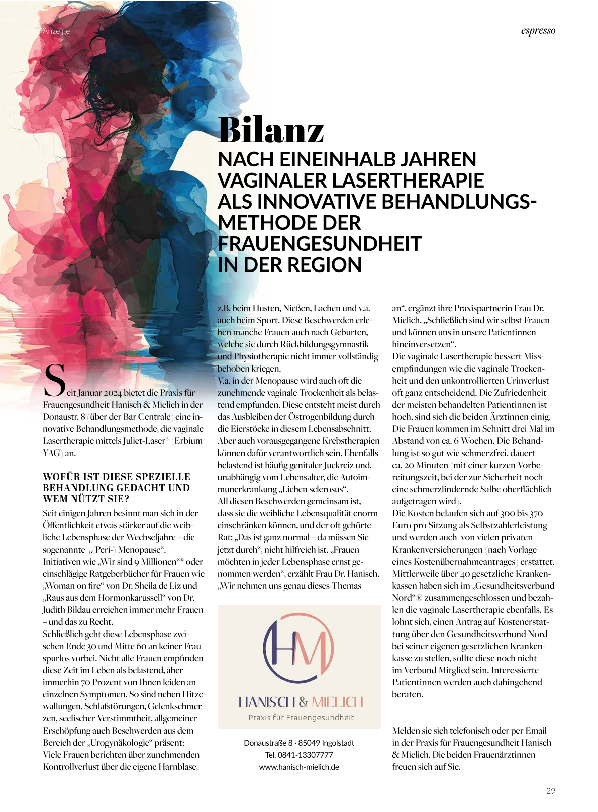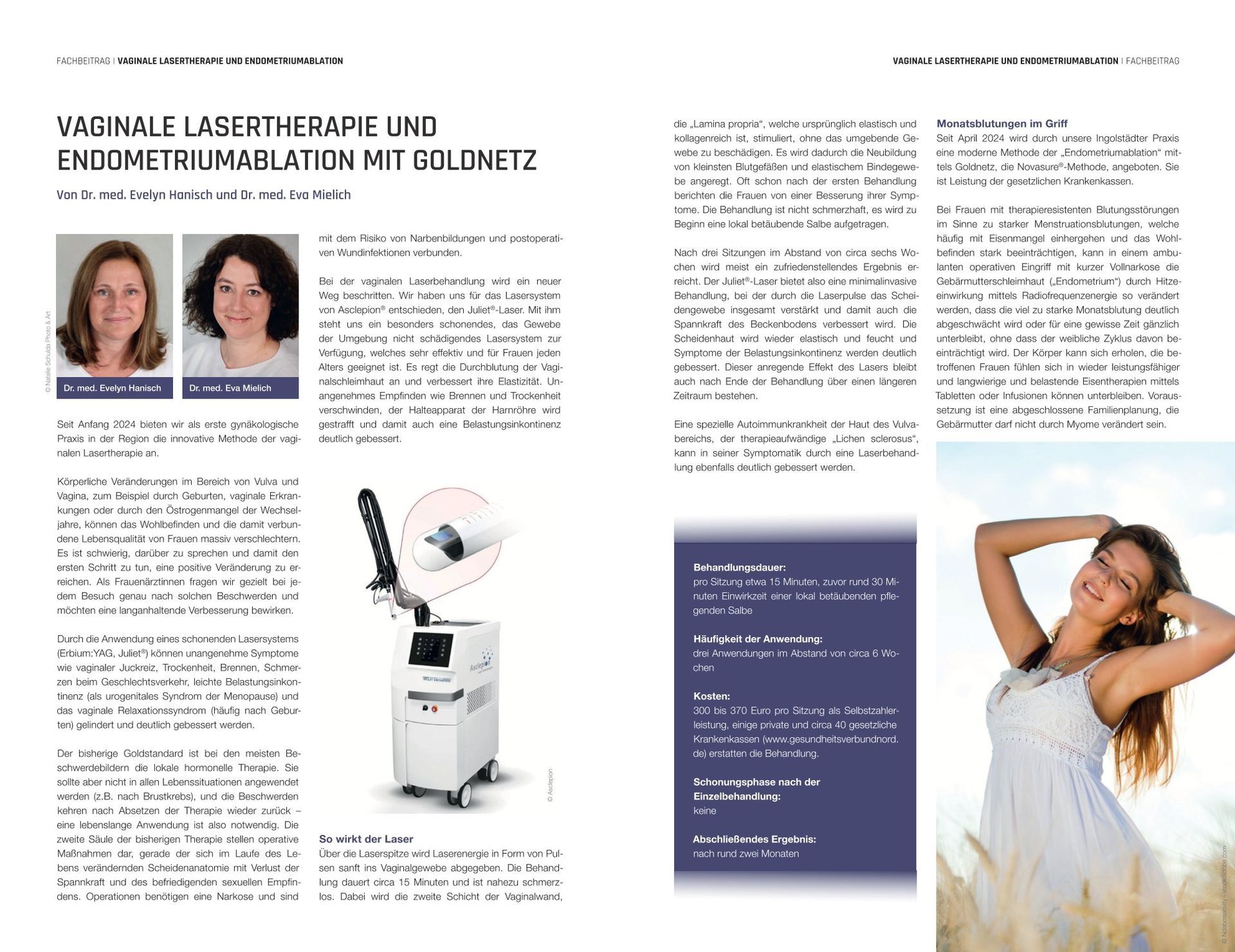 Der Körper kann sich so erholen, Sie fühlen sich wieder leistungsfähiger und langwierige und belastende Eisentherapien mittels Tabletten oder Infusionen können unterbleiben. Frau Dr. Hanisch führt den Eingriff in der „Praxisklinik Ingolstadt“ durch.
